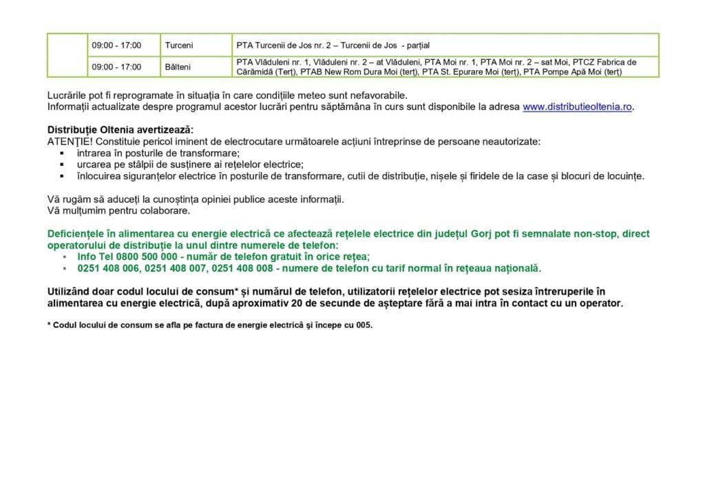 Distribuție Oltenia anunță întreruperea furnizării energiei electrice la consumatorii casnici și agenții economici, astfel: