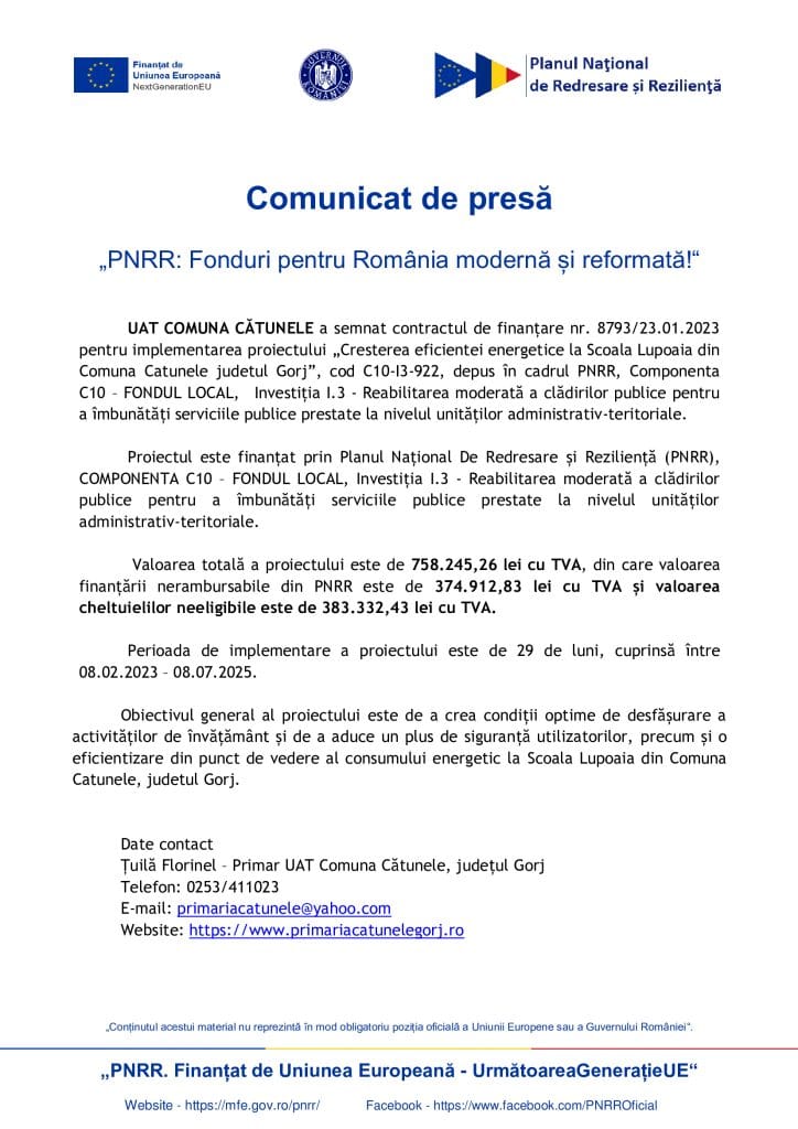 UAT COMUNA CĂTUNELE a semnat contractul de finanțare nr. 8793/23.01.2023 pentru implementarea proiectului „Cresterea eficientei energetice la Scoala Lupoaia din Comuna Catunele judetul Gorj”, cod C10-I3-922, depus în cadrul PNRR, Componenta C10 – FONDUL LOCAL, Investiția I.3 – Reabilitarea moderată a clădirilor publice pentru a îmbunătăți serviciile publice prestate la nivelul unităților administrativ-teritoriale.